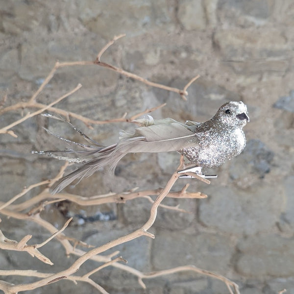Clip on pale gold glitter bird with real feather tail
